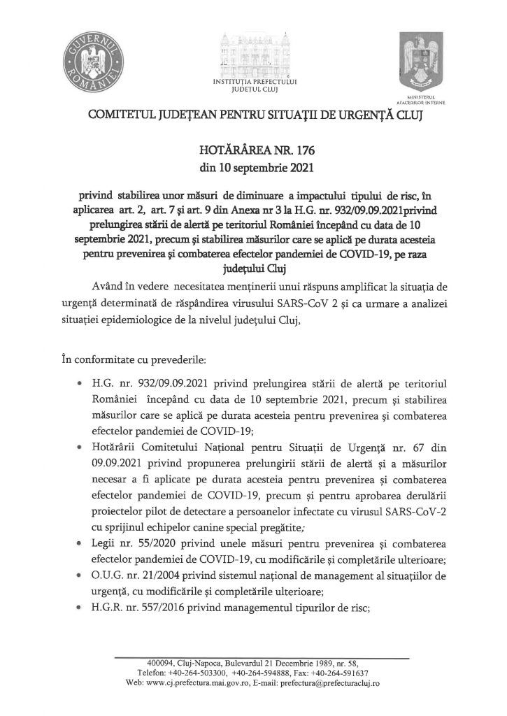 HCJSU 177/10.09.2021 – pentru aprobarea scenariilor de funcționare pentru unitățile de învățământ/conexe pentru începutul anului școlar 2021-2022 – Comitetul Județean pentru Situații de Urgență Cluj