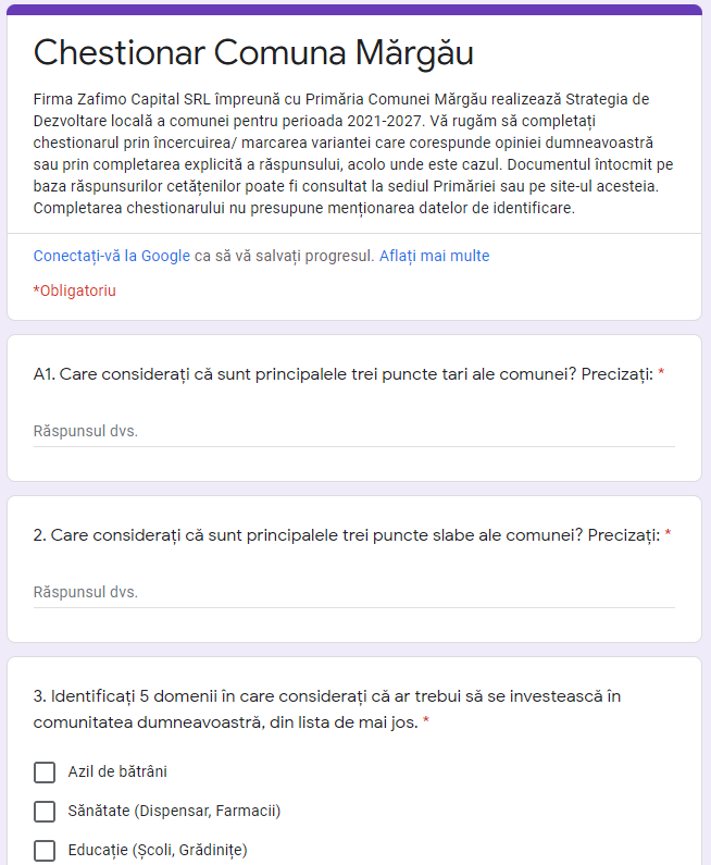 Dă click aici pentru completarea chestionarului online ! Firma Zafimo Capital SRL împreună cu Primăria Comunei Mărgău realizează Strategia